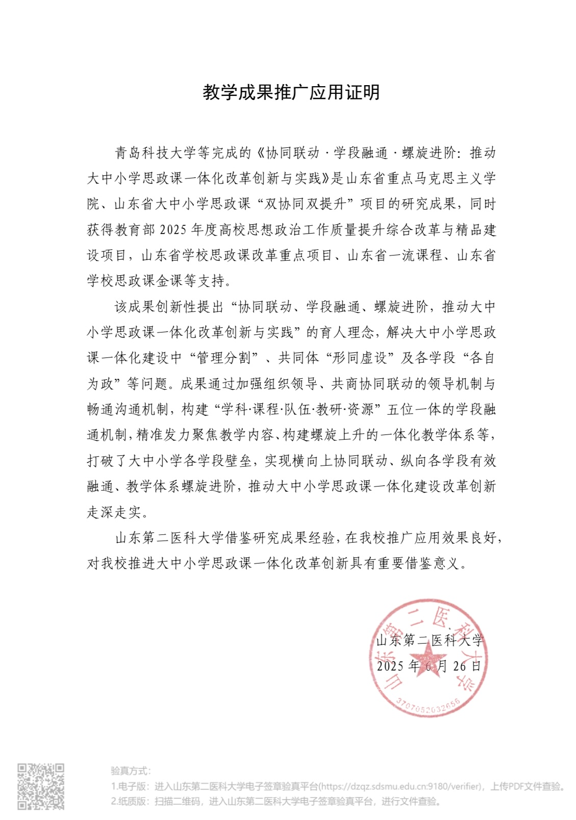 山东第二医科大学教学成果应用及效果证明