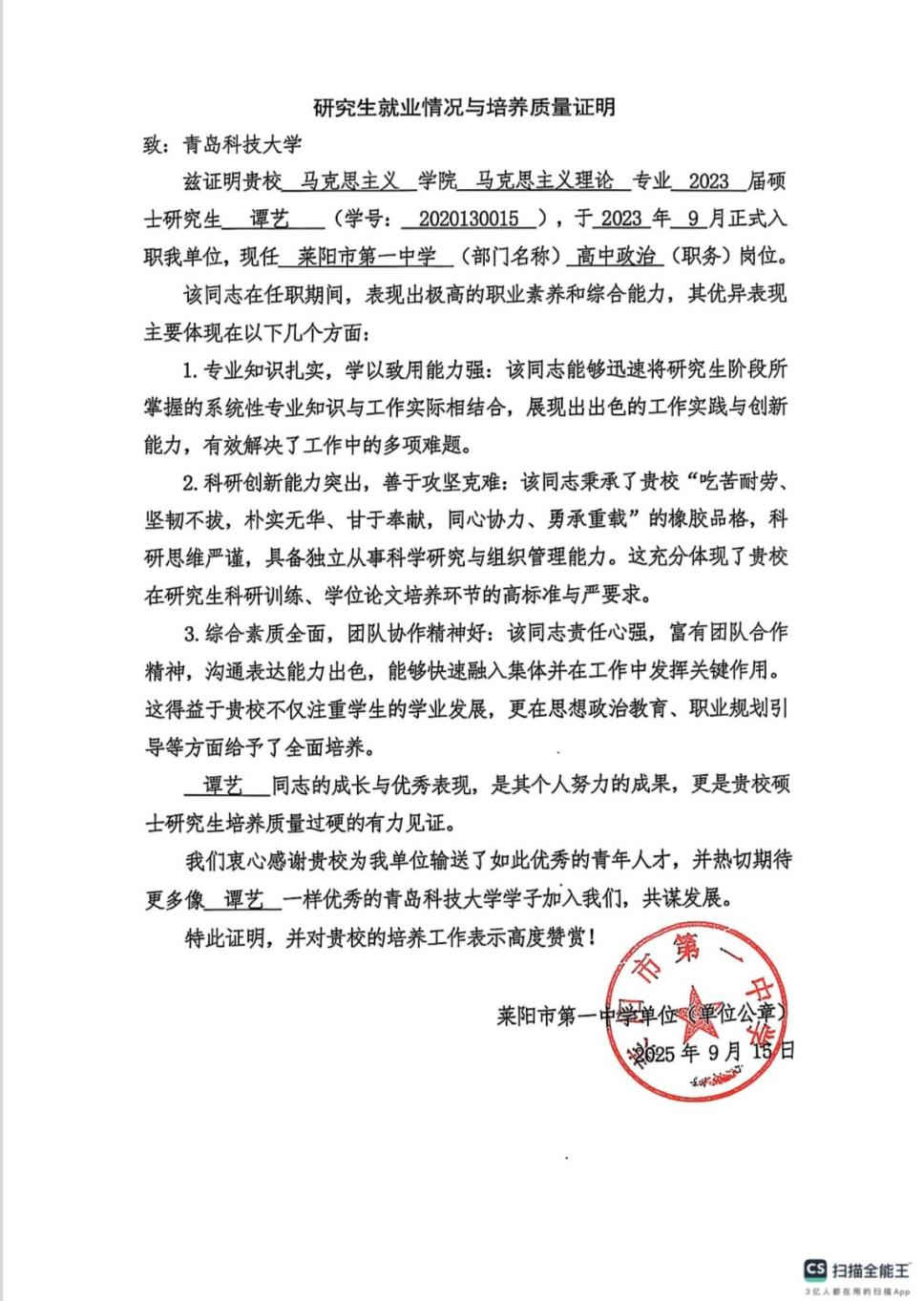 2023届太阳集团城娱8722硕士毕业生谭艺入职莱阳市第一中学思政课教师岗位