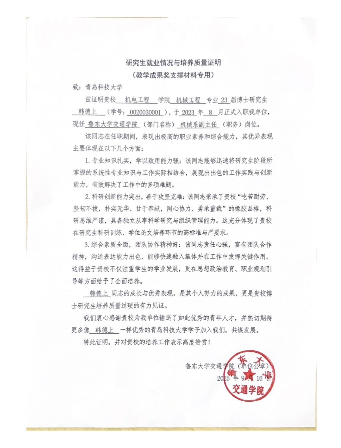 2023届机电工程学院博士研究生韩德上入职鲁东大学交通学院机械系副主任岗位