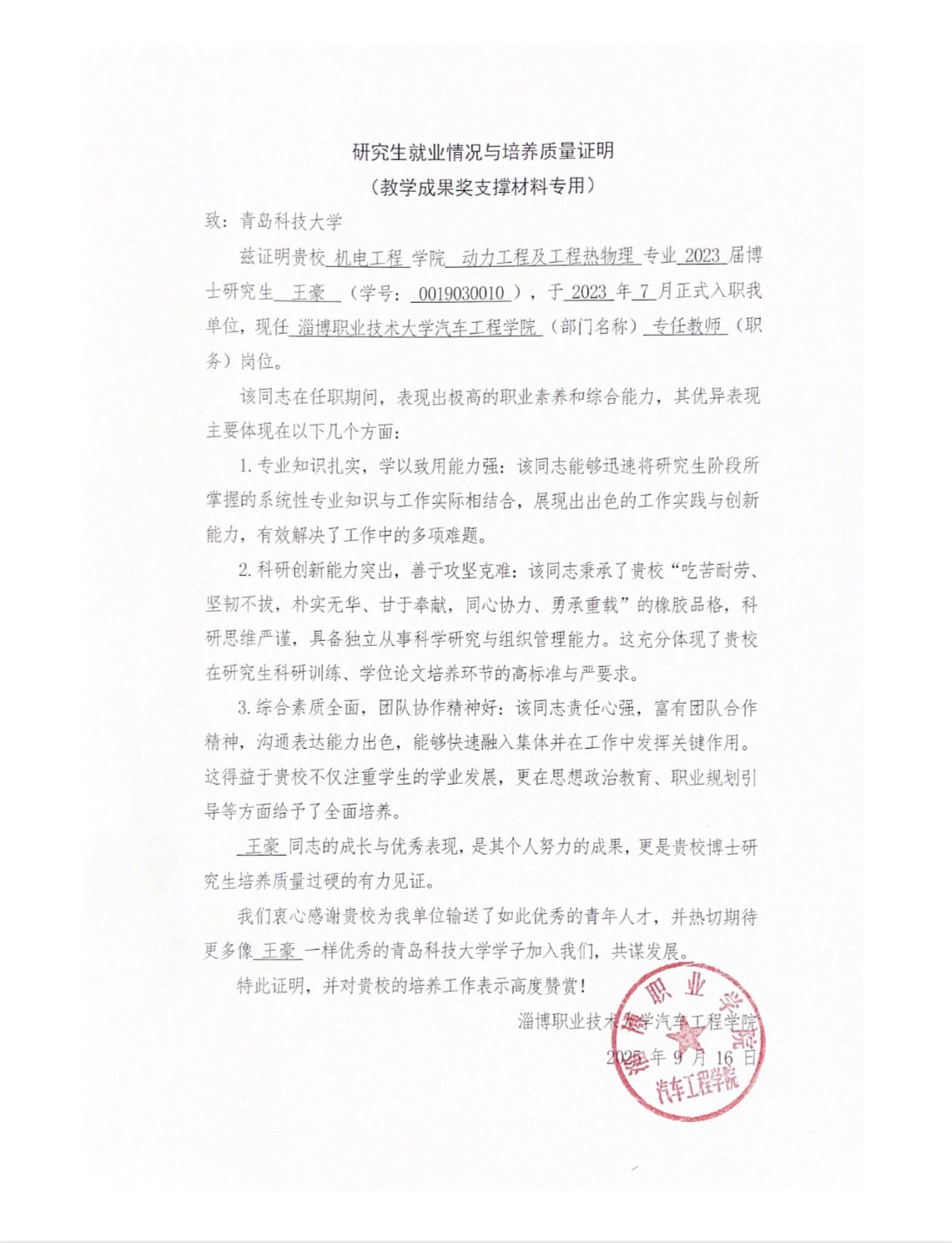 2023届机电工程学院博士研究生王豪入职淄博职业技术大学汽车工程学院专任教师
