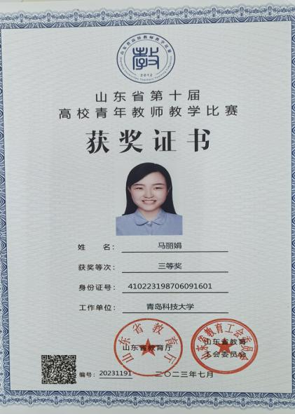 2023年:山东省第十届高校青年教师教学比赛三等奖——马丽娟