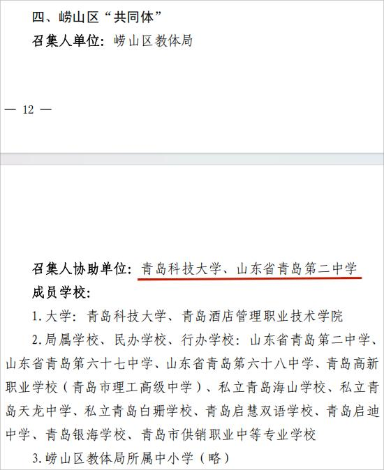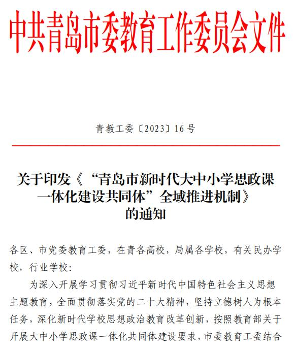 青教工委《“青岛市新时代大中小学思政课一体化建设共同体”全域推进机制》召集人协助单位